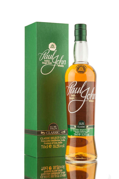 Paul John Classic Select Cask, an Indian single malt whisky matured in American white oak ex-bourbon barrels, bottled at cask strength, 55.2% vol.