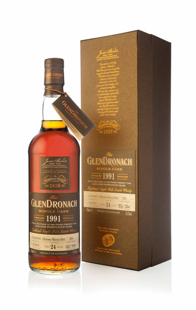 A 24 year old GlenDronach, distilled in 1991 and left to slumber in single cask #2683 (Oloroso sherry butt!) until 2016. Only 456 bottles filled fr...