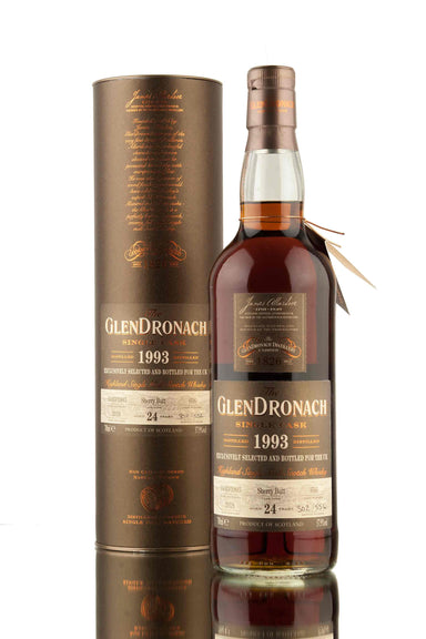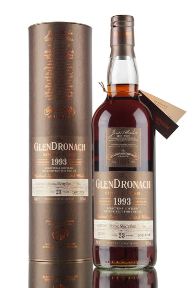A single sherry cask from GlenDronach distillery, bottled exclusively for the UK market. Distilled in 1993 and matured in sherry butt #656 for 24 y...