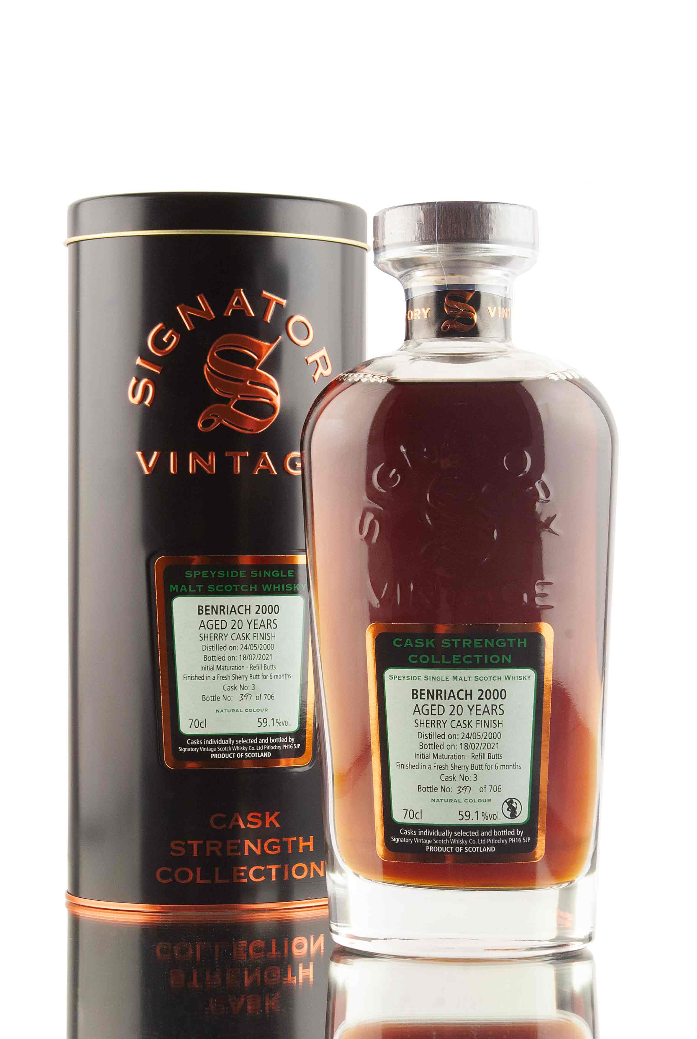 Zoom icon Click to expand Tap to zoom Chevron down icon Chevron down icon BenRiach 20 Year Old - 2000 | Cask 3 | Cask Strength Collection - Signatory by Signatory Sold out 1 2 3 4 5 6 7 8 9 10+ Quantity Chevron down icon Quantity Sold out Spinner icon FOLLOW US FOR THE LATEST RELEASES VIA Instagram, Facebook & Twitter A 2000 vintage BenRiach, bottled by Independent Scotch whisky bottler, Signatory. Matured for 20 years in sherry butts before being bottled February 2021 at 59.1% vol as part of the Cask Strength Collection series. Distillery BenRiach Age 20 Vintage 2000 Region Speyside ABV (Strength) 59.1 Bottling Date 2021 Cask Type Refill Butts | Fresh Sherry Butt Cask Number Cask 3 Bottle Size 70cl Cask Strength Yes No. of Bottles 706 Series Cask Strength Collection (Signatory) Style Speyside Single Malt Scotch Whisky Bottler Signatory Country Scotland Tasting Notes Awards