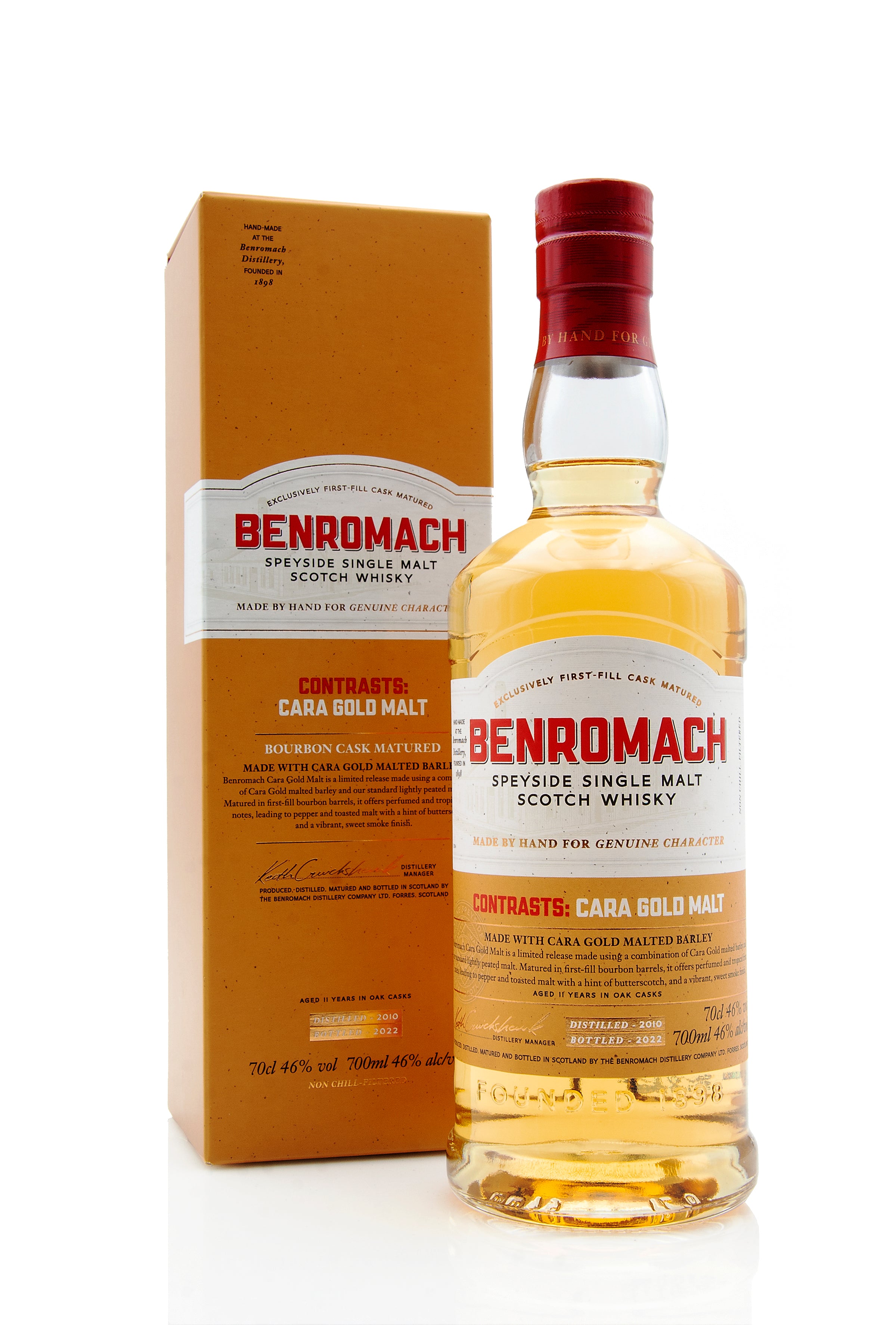 Benromach Cara Gold Malt, a new limited release crafted from a combination of Cara Gold malted barley and the standard lighted peated malt used at the distillery. Matured in the finest of first fill bourbon barrels for 11 years, Cara Gold malt is more typically used for beer brewing and is widely used for Golden Ales, making this a rather exciting new release.