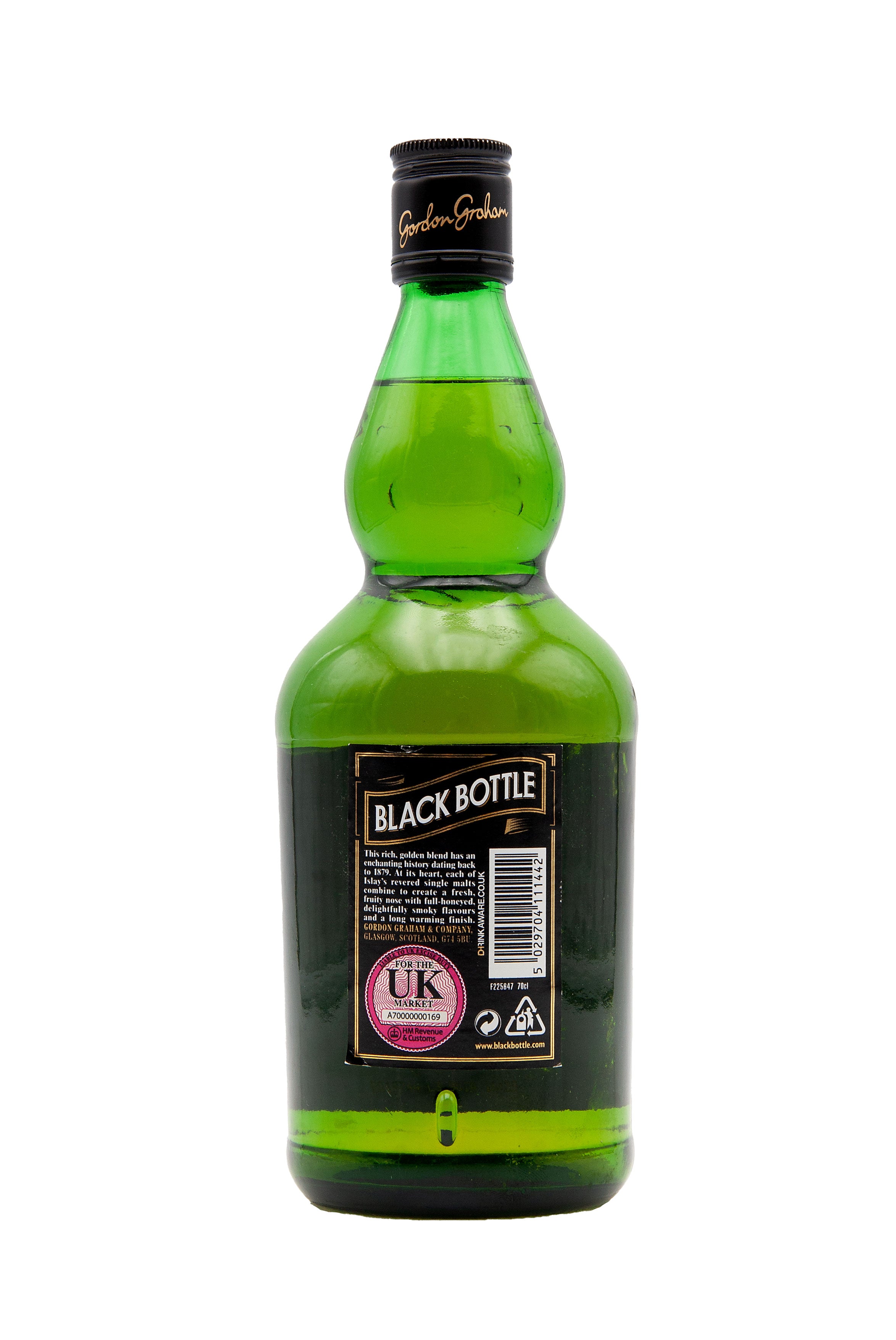 A pre-2013 bottle of Black Bottle, a blended Scotch whisky that has a rich history dating back to 1879. A smoky blend using various Islay malts at the heart of the recipe, bottled by Gordon Graham & Company at 40% vol.