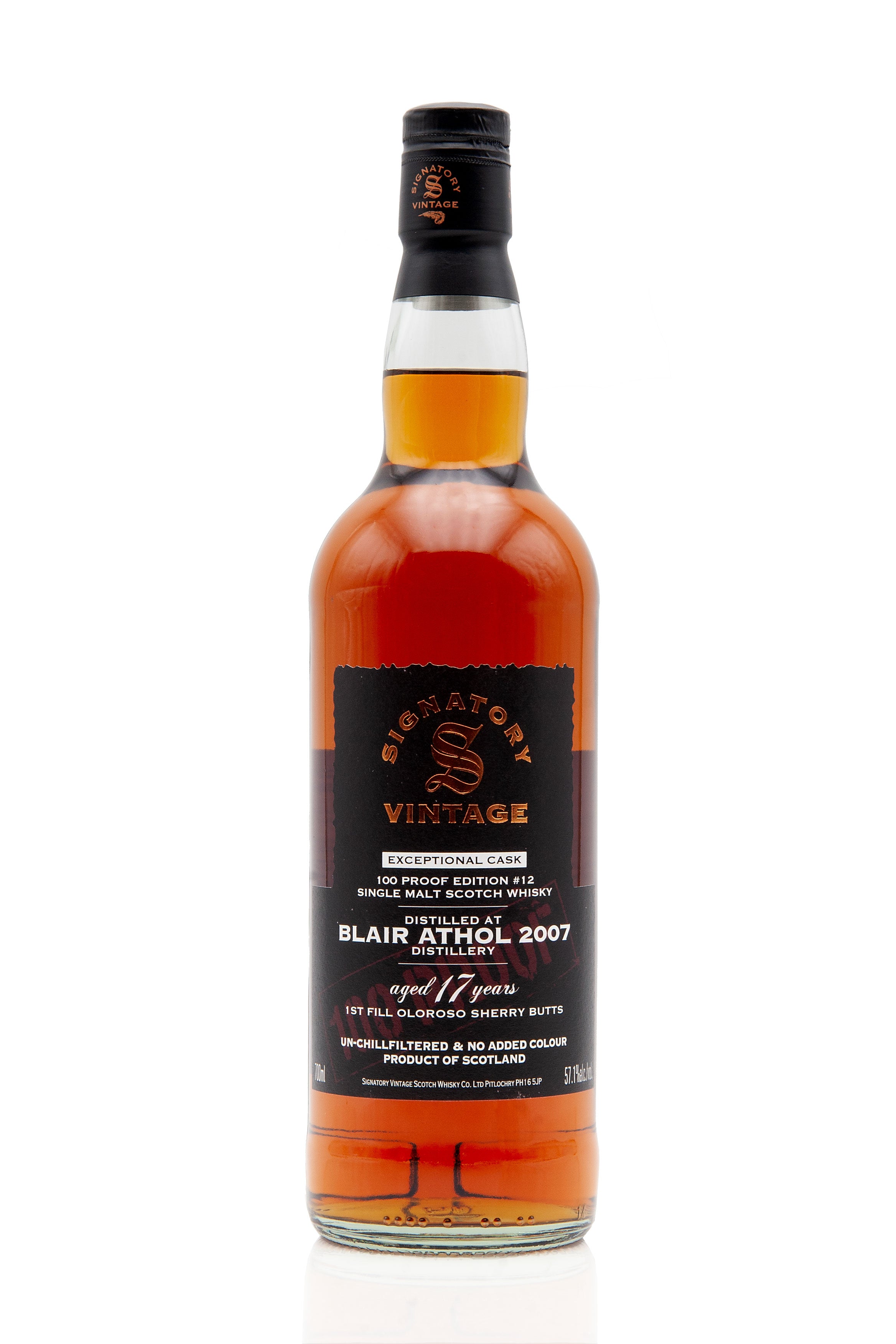 This delight of a dram has been released as part of the impressive 100 proof (Exceptional Cask) series from independent Scotch whisky bottler, Signatory. Distilled at Blair Athol distillery in Speyside and matured for 17 years in 1st Fill Oloroso Sherry Hogsheads, then bottled at the Edradour distillery at 57.1% vol, un-chillfiltered and without any additional colouring.