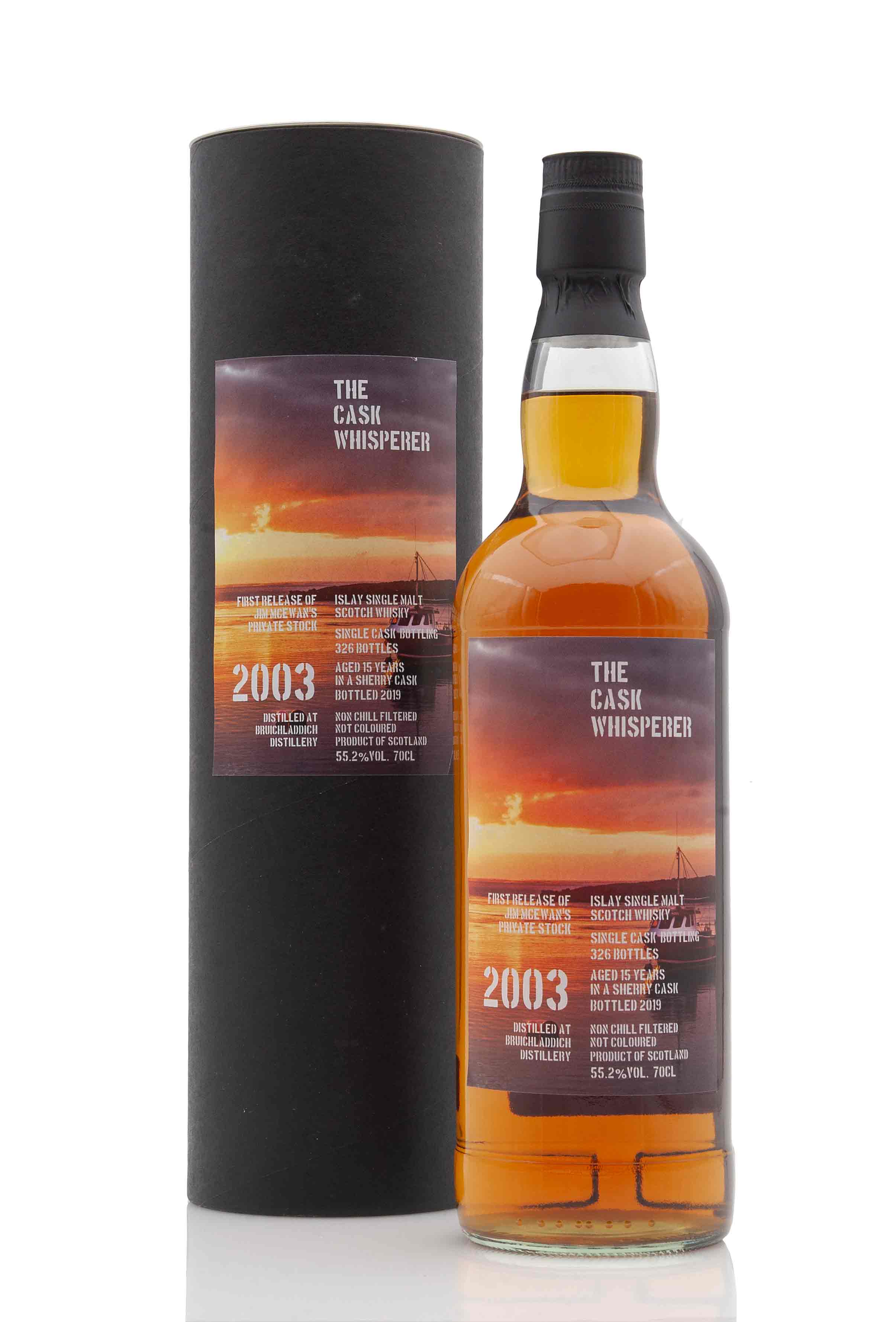 Zoom icon Click to expand Tap to zoom Chevron down icon Chevron down icon Bruichladdich 15 Year Old - 2003 | The Cask Whisperer by Bruichladdich Sold out 1 2 3 4 5 6 7 8 9 10+ Quantity Chevron down icon Quantity Sold out Spinner icon FOLLOW US FOR THE LATEST RELEASES VIA Instagram, Facebook & Twitter Released as part of Jim McEwan's private stock in 2019, this single cask bottling is one of only 326 bottled filled. Distilled in 2003 and matured in a sherry cask for 15 years, then bottled in 2019 at 55.2% vol. Distillery Bruichladdich Age 15 Vintage 2003 Region Islay ABV (Strength) 55.2 Bottling Date 2019 Cask Type Sherry Cask Bottle Size 70cl Cask Strength Yes No. of Bottles 326 Series Jim McEwan's Private Stock Style Islay Single Malt Scotch Whisky Country Scotland Tasting Notes Awards