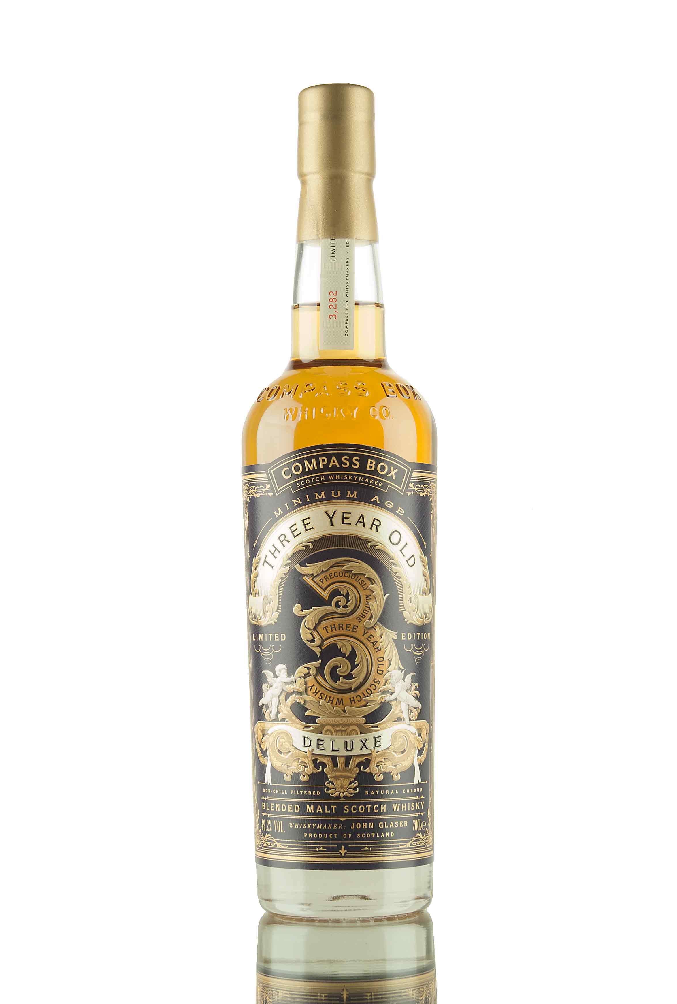 Zoom icon Click to expand Tap to zoom Chevron down icon Chevron down icon Compass Box 3 Year Old Deluxe by vendor-unknown Sold out 1 2 3 4 5 6 7 8 9 10+ Quantity Chevron down icon Quantity Sold out Spinner icon FOLLOW US FOR THE LATEST RELEASES VIA Instagram, Facebook & Twitter Compass Box Three Year Old Deluxe, a blended malt scotch whisky created from 1% three year old and 90% unstated aged malt from a distillery near Brora, along with a peaty 1st fill sherry cask matured whisky distilled on the Isle of Skye Age 3 ABV (Strength) 49.2 Bottling Date 2016 Bottle Size 70cl Style Blended Malt Scotch Whisky Bottler Compass Box Country Scotland Tasting Notes Awards