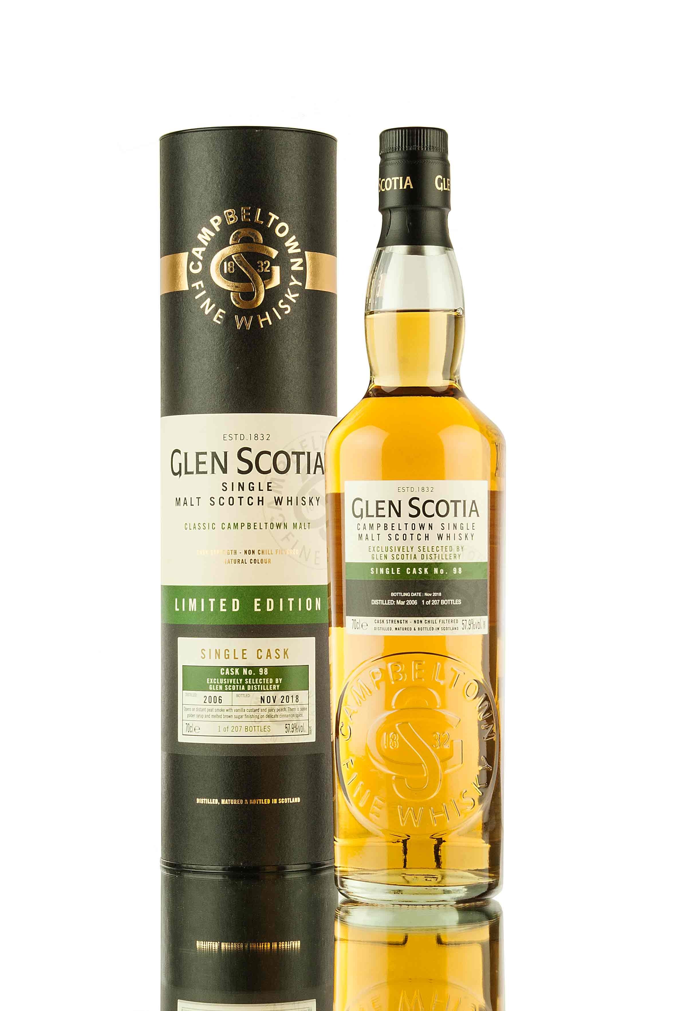 Zoom icon Click to expand Tap to zoom Chevron down icon Chevron down icon Glen Scotia 2006 Vintage - Single Cask 98 by vendor-unknown Sold out 1 2 3 4 5 6 7 8 9 10+ Quantity Chevron down icon Quantity Sold out Spinner icon FOLLOW US FOR THE LATEST RELEASES VIA Instagram, Facebook & Twitter Distilled March 2006 at the Glen Scotia distillery, Campbeltown and matured in single cask #98 until November 2018. A limited edition release, exclusively picked by Glen Scotia distillery, only 207 bottles filled at cask strength, 57.9% vol. Distillery Glen Scotia Vintage 2006 Region Campbeltown ABV (Strength) 57.9 Bottling Date 2018 Cask Number Single Cask 98 Bottle Size 70cl Cask Strength Yes No. of Bottles 207 Style Campbeltown Single Malt Scotch Whisky Bottler Distillery Bottling Country Scotland Tasting Notes Awards