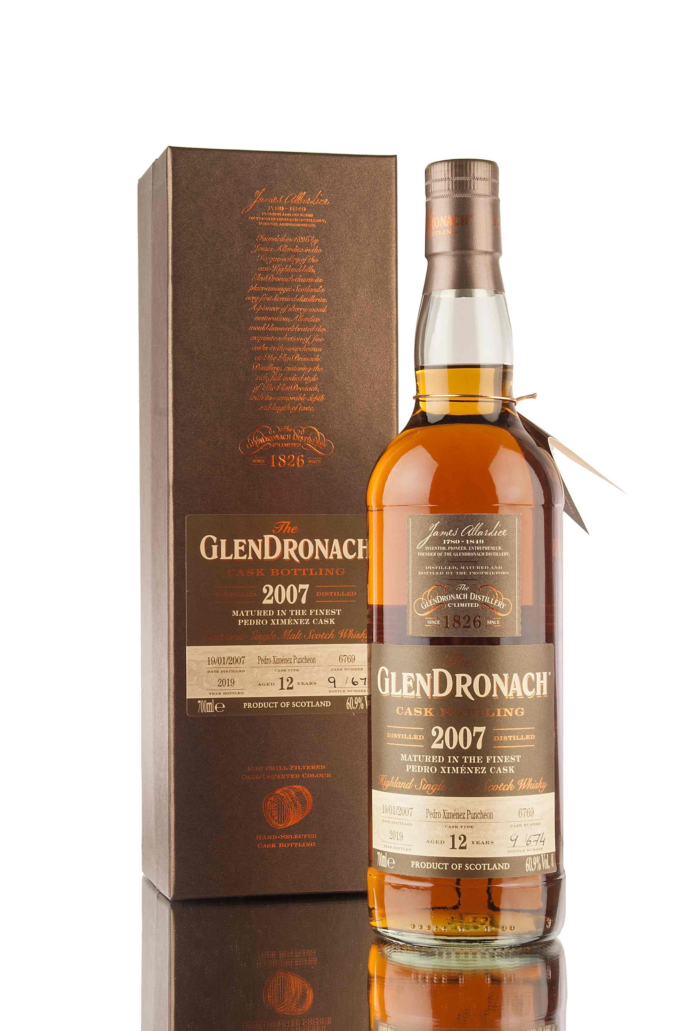 Zoom icon Click to expand Tap to zoom Chevron down icon Chevron down icon GlenDronach 12 Year Old - 2007 | Cask 6769 | Batch 17 by vendor-unknown Sold out 1 2 3 4 5 6 7 8 9 10+ Quantity Chevron down icon Quantity Sold out Spinner icon FOLLOW US FOR THE LATEST RELEASES VIA Instagram, Facebook & Twitter The youngest release from Batch 17 comes from cask 6769, an Pedro Ximénez sherry puncheon. Distilled in 2007 and matured for 12 years, bottled in 2019, 674 bottles filled at 60.9% vol. Distillery Glendronach Age 12 Vintage 2007 Region Highland ABV (Strength) 60.9 Bottling Date 2019 Cask Type PX Sherry Puncheon Cask Number Single Cask 6769 Bottle Size 70cl Cask Strength Yes No. of Bottles 674 Series GlenDronach Batch 17 Style Highland Single Malt Scotch Whisky Bottler Distillery Bottling Country Scotland Tasting Notes Awards