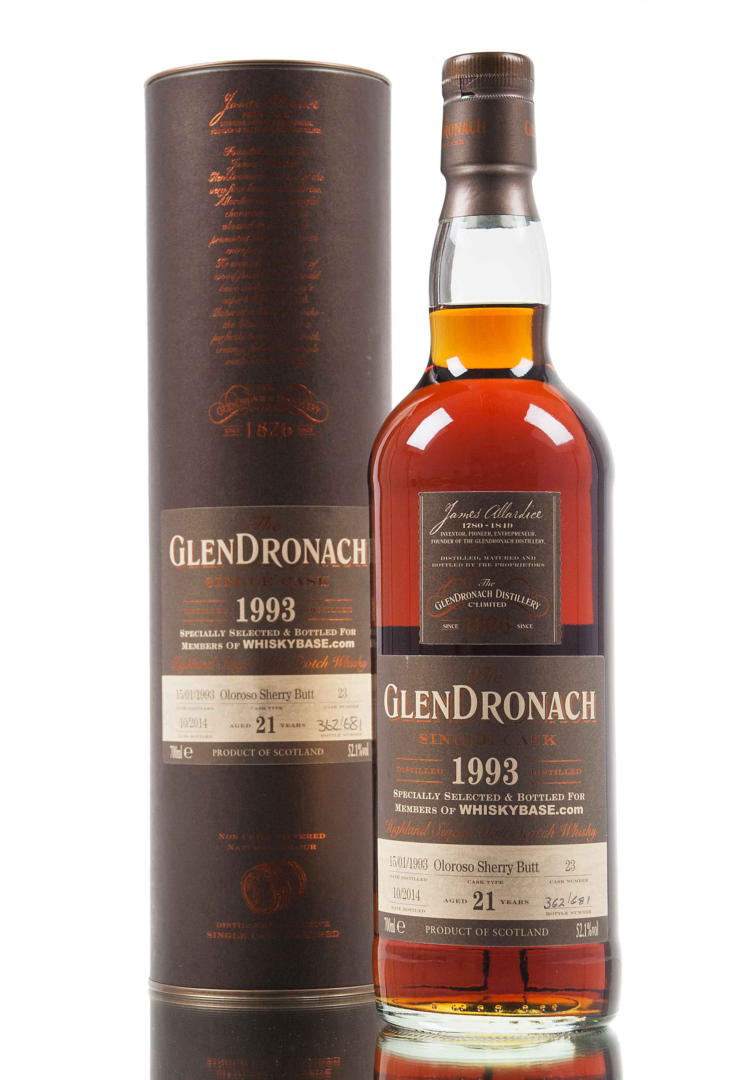 GlenDronach single cask 23, distilled in 1993 and aged for 21 years in an Oloroso sherry butt. Bottled in 2014 at cask strength, 52.1% vol.