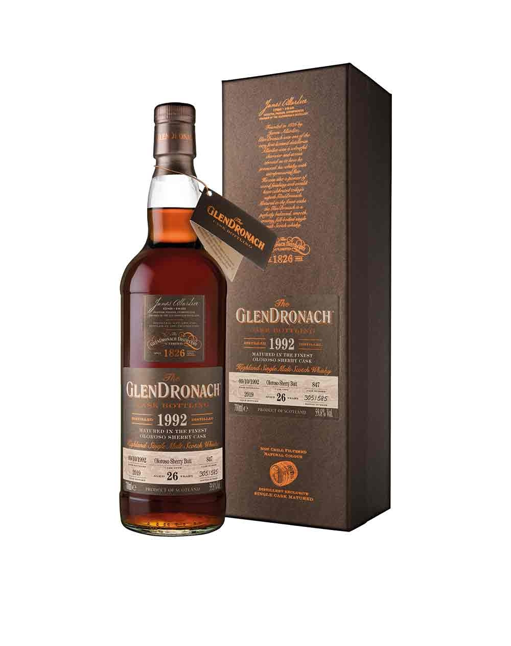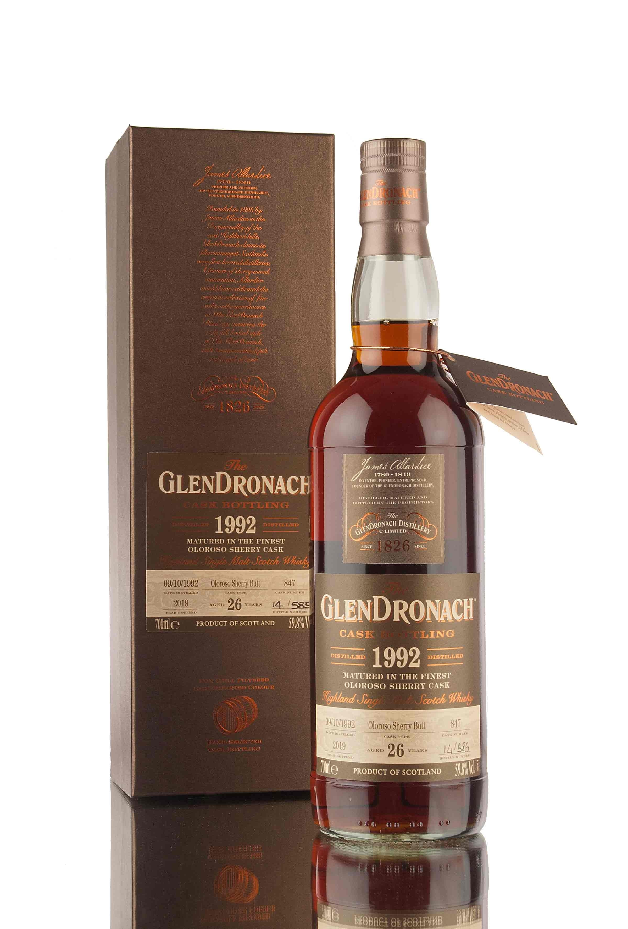 Zoom icon Click to expand Tap to zoom Chevron down icon Chevron down icon GlenDronach 26 Year Old - 1992 | Cask 847 | Batch 17 by vendor-unknown Sold out 1 2 3 4 5 6 7 8 9 10+ Quantity Chevron down icon Quantity Sold out Spinner icon FOLLOW US FOR THE LATEST RELEASES VIA Instagram, Facebook & Twitter Distilled in 1992 and matured for 26 years, single cask 847 has been released for the 17th Batch of single casks from GlenDronach distillery. 585 bottles filled at 59.8% vol from an Oloroso sherry butt. Distillery Glendronach Age 26 Vintage 1992 Region Highland ABV (Strength) 59.8 Bottling Date 2019 Cask Type Oloroso Sherry Butt Cask Number Single Cask 847 Bottle Size 70cl Cask Strength Yes No. of Bottles 585 Series GlenDronach Batch 17 Style Highland Single Malt Scotch Whisky Bottler Distillery Bottling Country Scotland Tasting Notes Awards