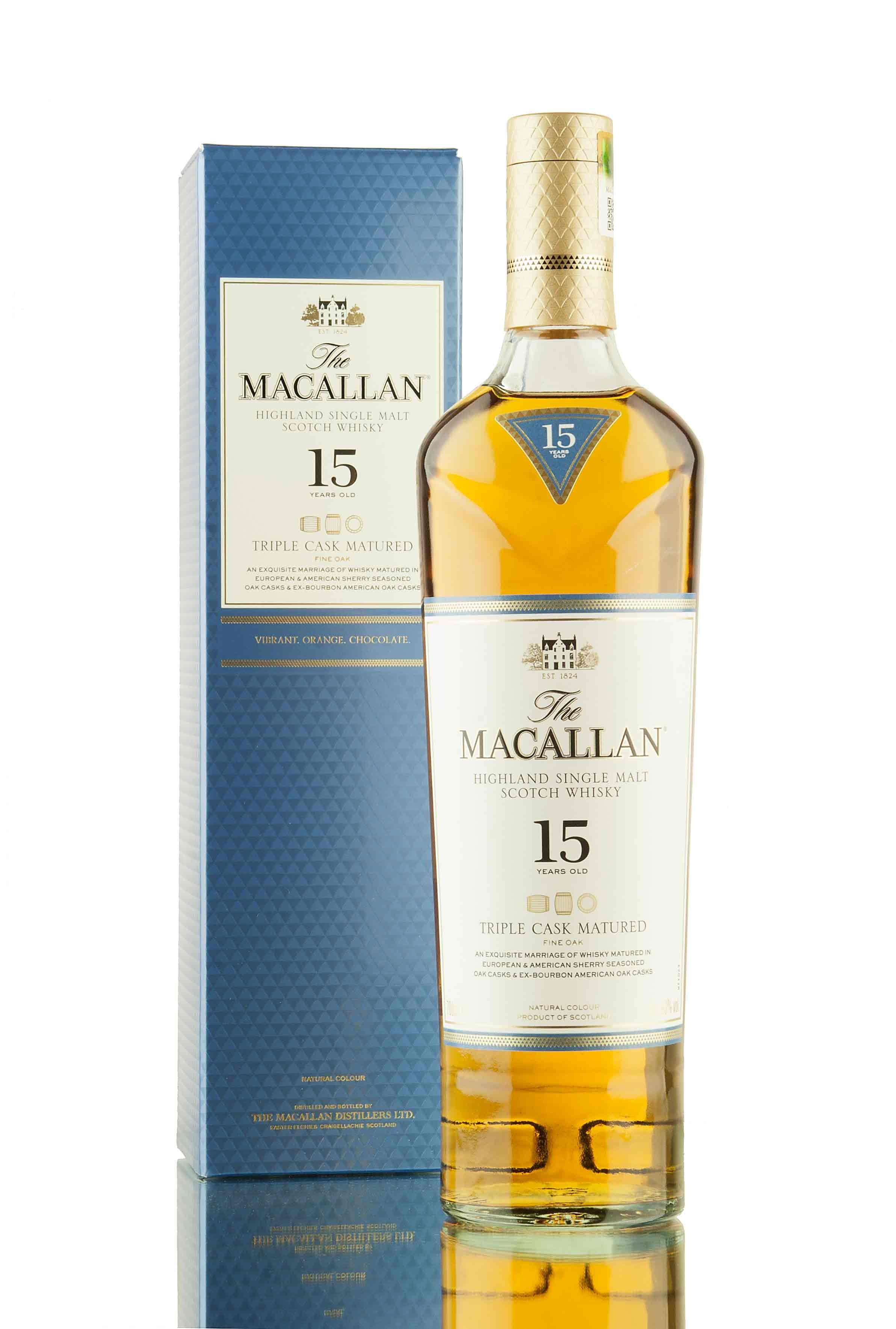 Zoom icon Click to expand Tap to zoom Chevron down icon Chevron down icon Macallan 15 Year Old Triple Cask Matured Fine Oak by Macallan Sold out 1 2 3 4 5 6 7 8 9 10+ Quantity Chevron down icon Quantity Sold out Spinner icon FOLLOW US FOR THE LATEST RELEASES VIA Instagram, Facebook & Twitter Part of the Triple Cask Matured range from Macallan distillery, this 15 year old single malt Scotch whisky has been matured in a combination of European and American sherry seasoned oak casks and ex-bourbon American oak casks. Distillery Macallan Age 15 Region Speyside ABV (Strength) 43 Bottle Size 70cl Style Speyside Single Malt Scotch Whisky Bottler Distillery Bottling Country Scotland Tasting Notes Awards